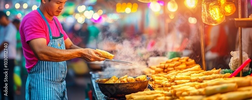 Vendor cooking crispy spring rolls, crowded street market, neon lights
