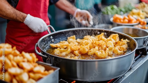 Vendor frying tempura vegetables, sizzling oil, street food, crispy snacks