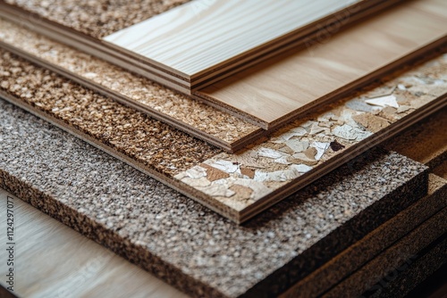 Veneer covered particleboard is sliced into small sections Supplies for furniture makers Bright backdrop