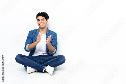Venezuelan man sitting on the floor applauding after presentation in a conference