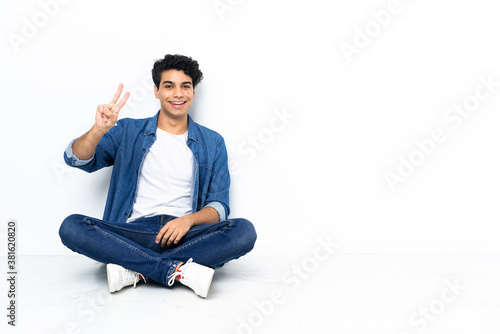 Venezuelan man sitting on the floor smiling and showing victory sign