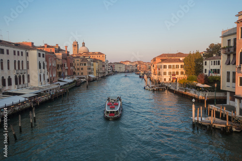 Venice , Italy - October 17 2018: Sailing on a wooden boat through venice on a bright day with a clear blue sky.