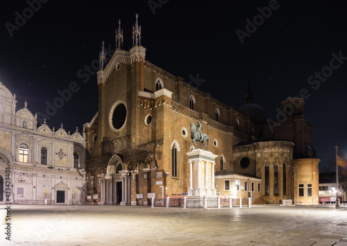 Venice, Italy 26 January 2021: Night photography taken during a walk through the streets of Venice in Italy to one of the many churches present in the city. Long exposure technique