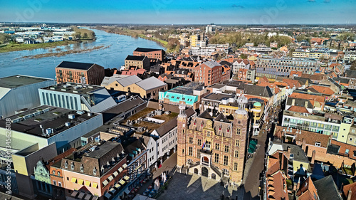 Venlo city center aerial skyline view from above, historic townhall, buildings architecture and Meuse river, Venlo town drone cityscape, the Netherlands