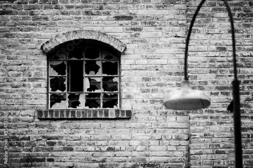 ventana de edificación antigua abandonada despues de la guerra, con vidrios rotos