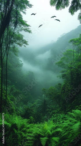 Verdant rainforest landscape with birds flying in a misty atmosphere
