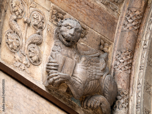 Verona dome cathedral church exterior sculptures detail. Romanesque sculpture attributed to the workshop of Veronese sculptor Brioloto