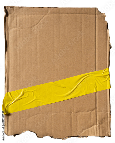 Vertical 4x5 ratio rectangular cardboard with yellow parcel tape label. Card board paper with ripped and burnt edges