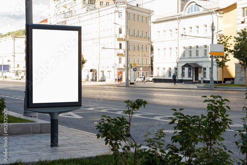 Vertical billboard near the road in the city. Sun illuminates the buildings very brightly. Mock-up.