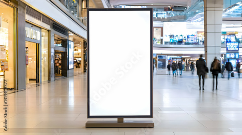 Vertical Blank White Digital Display Banner Stand Mockup With Copy Space For Advertisement In Modern Shopping Mall Blurred People In Background
