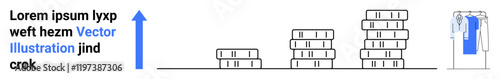 Vertical blue arrow pointing up, stacks of coins increasing in height, clothing on hanger. Ideal for business growth, financial success, economic improvement, wealth accumulation, investment, retail