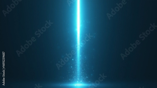 Vertical blue light beam glows through dark misty background.