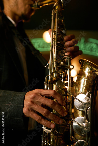 Vertical close up on saxophonists fingers playing brass instrument creating jazz music during live performance in dimly lit bar