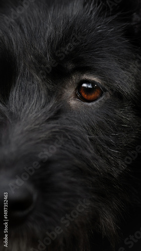 vertical close-ip photo of young cute mongrel dog with black straight fur, brown eye, black nose