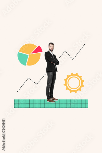 Vertical collage picture illustration attractive young beard successfully man leader company strategy income colorful background