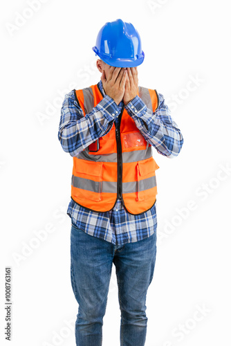vertical Despondent construction worker covering his face with hands wearing orange vest and helmet