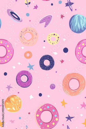 Vertical Fashion pink abstract seamless pattern with space donuts, planet, cosmic elements.