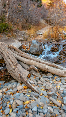 Vertical frame Bridge made of tree trunk over a rocky creek with shallow flowing water