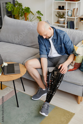Vertical full length portrait of adult man putting on prosthetic leg at in home setting