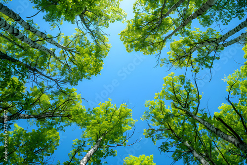 Vertical image of clear blue sky and green trees, perfect for earth day or world environment day desktop backgrounds.