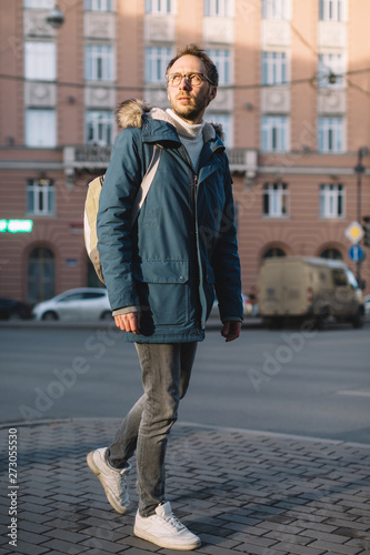 Vertical photo of handsome adult male in blue jacket with green backpack. Pretty man with beard and glasses walking on the street. Tourist exploring new city, travel. Cold season, autumn or winter.