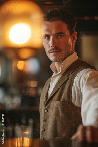 Vertical portrait of a bartender in a vintage tweed vest and white shirt working behind the bar.