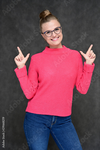 Vertical portrait of a beautiful blonde girl with glasses in a coral sweater and blue jeans on a gray background. Stands in different poses with emotions.