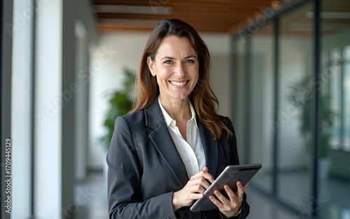 Vertical portrait of Latin mature adult professional business woman looking at camera and smiling. European businesswoman CEO holding digital tablet using fintech tab application standing in office.
