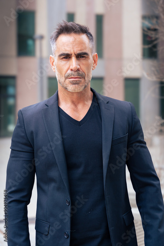 Vertical portrait of serious businessman looking at camera outdoors.
