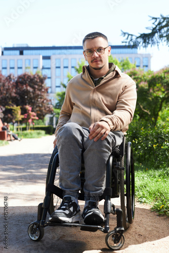 Vertical portrait of young man sitting in wheelchair and looking at camera during his walk in the city in summer
