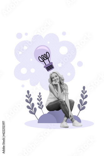 Vertical poster picture collage of happy positive girl sitting outside nature brilliant excellent idea isolated on painted background.