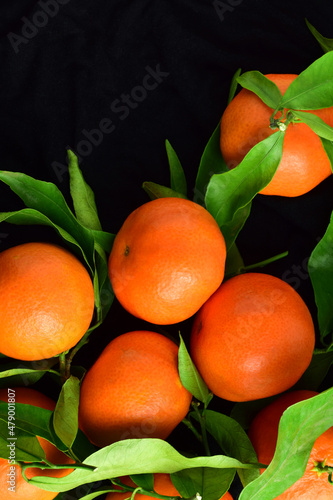 Vertical shot, mandarins with their leaves, top view, black background with space.