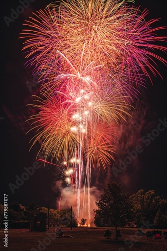 Vertical shot of vibrant, colorful fireworks exploding in the darkness at night
