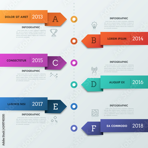 Vertical timeline with 6 arrow-shaped stripes, thin line icons, letters, year indication and text boxes. Realistic infographic design template. Vector illustration for brochure, corporate report.