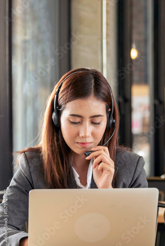 Vertical Women helpdesk CSR call center use headphones talk to customer. Asian woman operator assistant customer service relationship agent. Vertical Woman use laptop video call online meeting