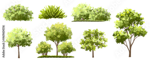 Vertor set of green tree,plants side view for landscape elevations,element for backdrop,eco environment concept design,watercolor greenery scene