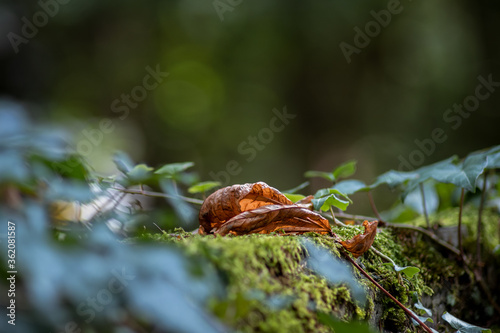 vertrocknetes Blatt auf Moos bei schwacher Tiefenschärfe