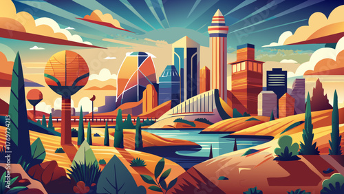 Very beautiful Dallas vector travel poster in cinematic minimal landscape art style, showcasing the city skyline, modern architecture, and warm sunset tones that capture Texas’s vibrant urban spirit.