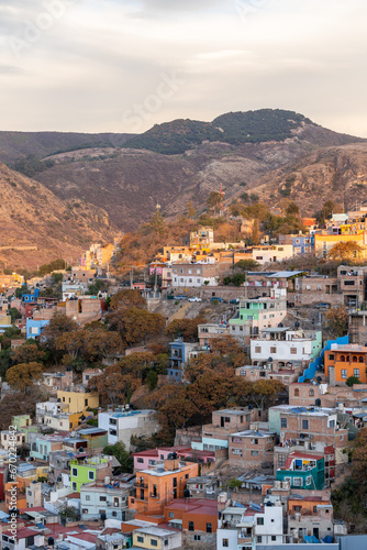 Very beautiful view of the city at sunset in the Mexican city of Guanajuato surrounded by large mountains.