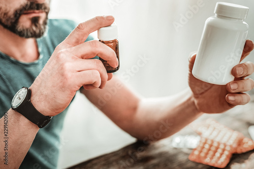 Very ill. Close up of bottles with medicine being in hands of nice bearded man