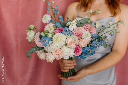Very nice young woman holding a beautiful blossoming flower bouquet of fresh dahlias and roses