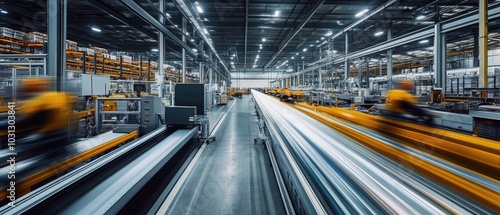 Very realistic and photographic photo of a sleek, high-tech warehouse with automation machinery and blurred workers in action The long exposure creates a sense of speed and productivity Styled like a