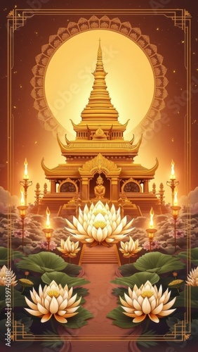 Vesak, Buddha Purnima. Painting of a temple with a golden roof and a lotus flower in the foreground. The painting has a serene and peaceful mood