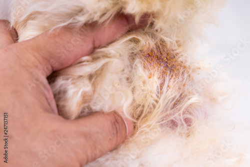 Vet examining dog body skin with bad yeast fungal infection