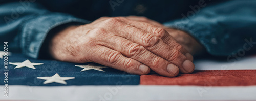 veterans hand rests solemnly on American flag, symbolizing honor and sacrifice. close up captures details of hand, reflecting deep emotional connection to flag