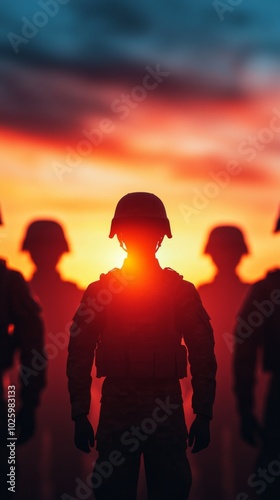 Veterans in Formation Against a Sunset Background