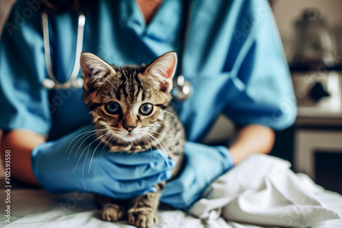 Veterinarian examining a cat in a veterinary clinic, closeup. Generative Ai