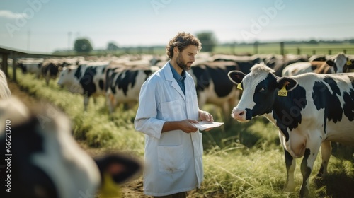 Veterinarian with digital tablet inspecting cows while feeding on dairy farm.