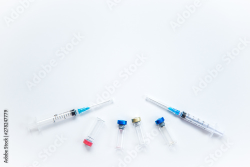 Veterinary and medical glass vials and two syringes for vaccination on a white isolated background. Liquid drug or vaccine to treat people and Pets against viruses, diseases, flu, rabies. Copy spase