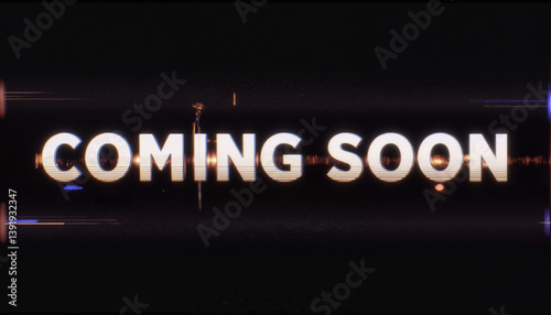 VHS glitch-style "COMING SOON" text on black background, nostalgic ambiance. Old style, 1980 style concept